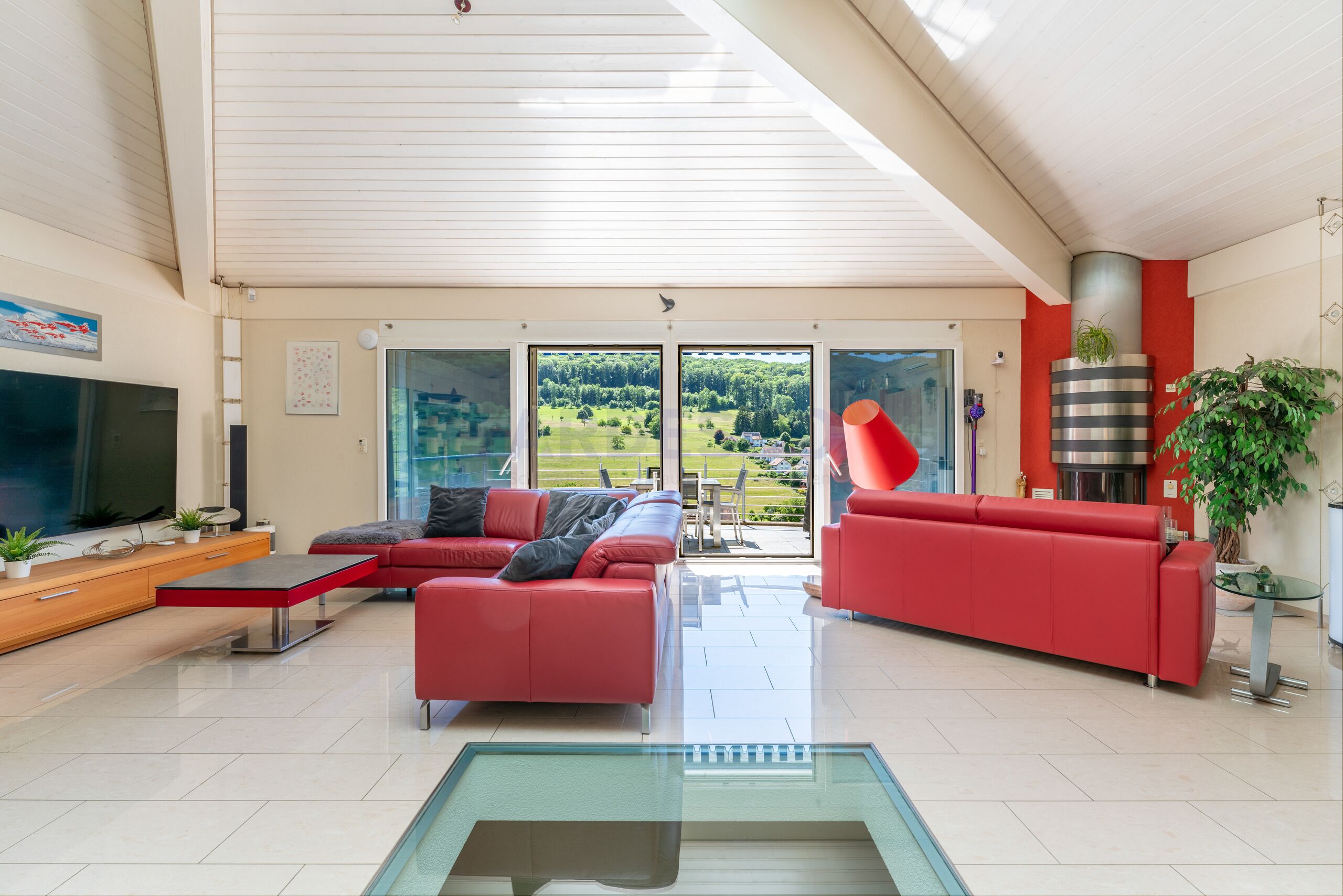 Im Innern erwartet Sie ein stimmiges Wohnkonzept mit hellen, weitläufigen Räumen und einer Architektur, die Alltag und Genuss mühelos vereint. Edle Materialien, klare Linien und eine durchdachte Raumführung schaffen ein Wohngefühl, das sowohl modern als auch zeitlos wirkt. Dank der grosszügigen Verglasung fliesst das Tageslicht ungehindert durch alle Räume und verleiht dem Haus eine angenehme Leichtigkeit.